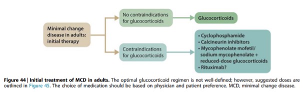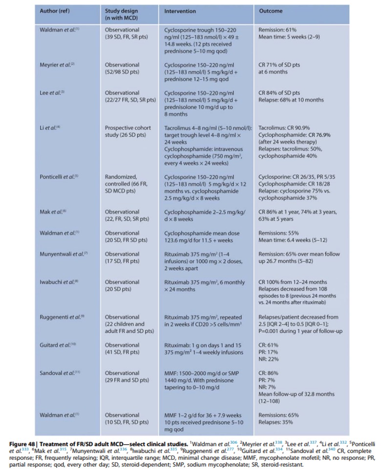 Er zijn weinig studies naar glucocorticoĆÆdsparende of glucocorticoĆÆdvrije behandelschemaās voor de intitiele behandeling van MCD. Alternatieve schemaās worden overwogen bij patiĆ«nten met relatieve contra-indicaties (bijv. ernstige hyperglykemie, osteoporose of hoog risico op psychiatrische ontregeling) of die niet bereid zijn glucocorticoĆÆden te gebruiken. Cyclofosfamide en ciclosporine worden geassocieerd met remissiepercentages van ongeveer 75% ondanks de beperkte ervaring bij dit ziektebeeld (Figuur 45). In een RCT was mycofenolaat met een verlaagde dosis prednison (0,5mg/kg/dag, maximaal 40mg per dag) vergelijkbaar met conventionele hoge dosis prednison alleen (1mg/kg/dag, maximaal 80mg per dag) voor het bereiken van remissie met bovendien vergelijkbare recidiefpercentages en frequentie van ernstige bijwerkingen. In een RCT waarin oraal tacrolimnus 0,05mg/kg tweemaal daags werd vergeleken met prednison 1mg/kg/dag tot maximaal 60mg, waren de percentages complete remissie en recidief niet verschillend tussen de twee armen. Rituximan (4-wekelijks 375mg/m2) werd gebruikt om 6 patienten met MCD te behandelen als eerstelijnsbehandeling, waarbij 5 van de 6 patienten complete remissie ondergingen en 1 patient een afname van 75% in proteinurie ervoer. Geen enkele patient kreeg een recidief tijdens de follow-up van 8-36 maanden, ondank het herstel van het aantal B-cellen.