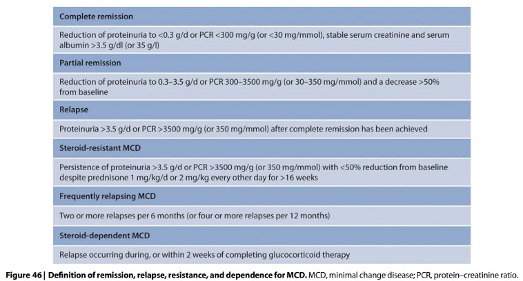 Een minderheid van de patiënten met een MCD ontwikkeld een recidief na een complete remissie. Ongeveer 33% van de patiënten ontwikkelt frequente recidieven (11-29%) of wordt steroïd-afhankelijk (14-30%). Definities van remissie en terugval die nuttig zijn bij de classificatie van MCD staan in Figuur 46.